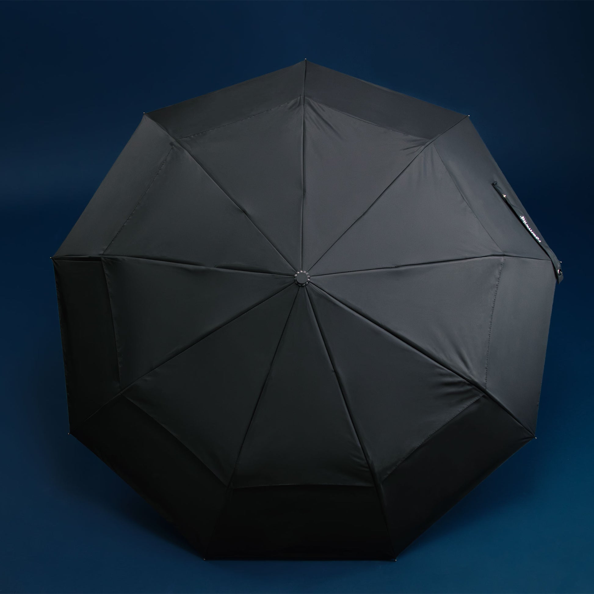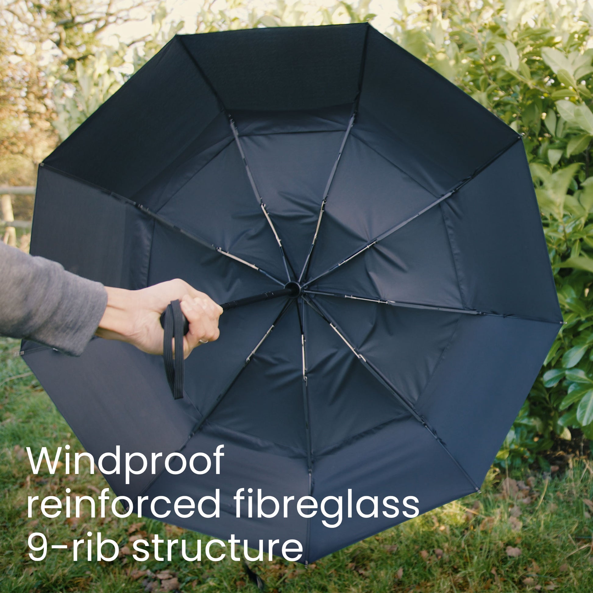 - The three-fold chrome plated black metal shaft, and the reinforced fibreglass 9 rib structure allows for much greater stability in high winds. The non slip rubberised handle with lanyard allows for easy carrying.