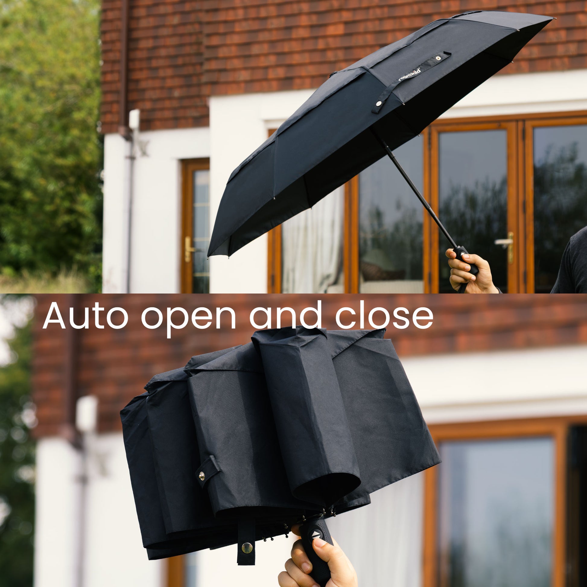 - Features an auto open/close function and non-slip rubberised handle making it convenient and easy to use. Stay dry with confidence and style with this superior umbrella.