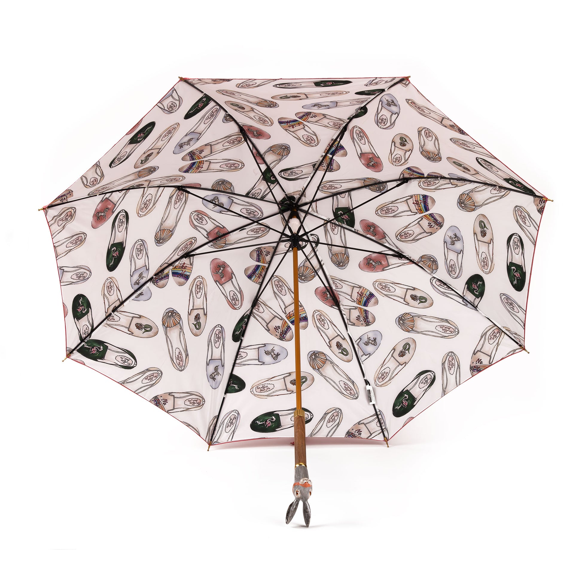 - Uniek ontwerp: Deze paraplu heeft een speelse print van verschillende schoensilhouetten op een lichte achtergrond met een contrasterende roze onderkant.